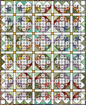 Lay out all your units as shown at left. Sew three horizontal rows,